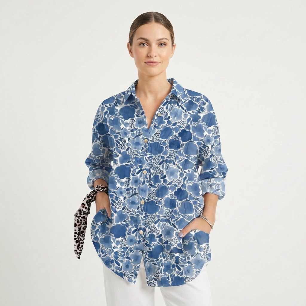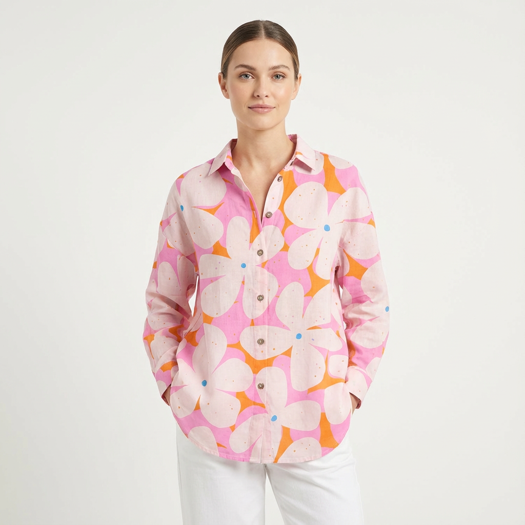 This women’s long sleeve shirt features a bold graphic print with a classic button front, offering an easy way to add colour and personality to everyday outfits. Designed for relaxed styling, it provides a balance between casual comfort and a put-together look.