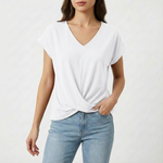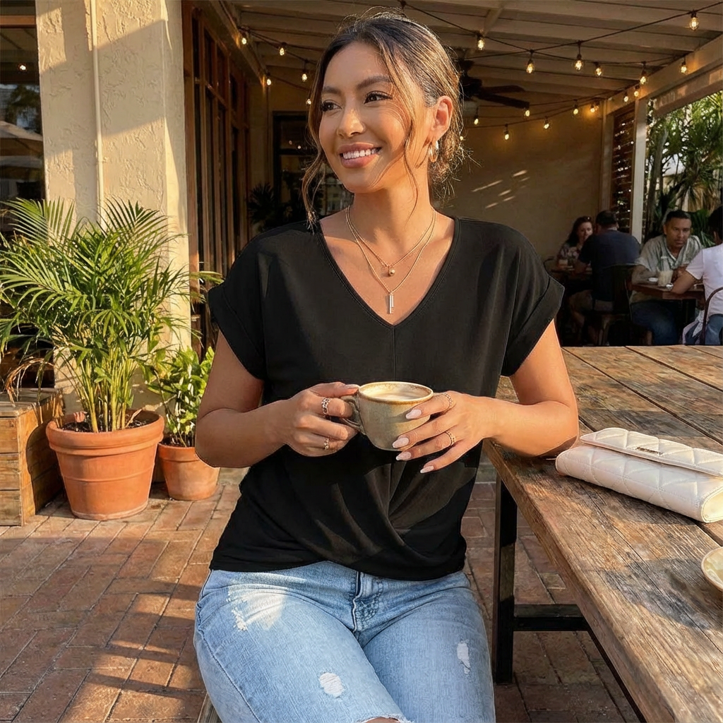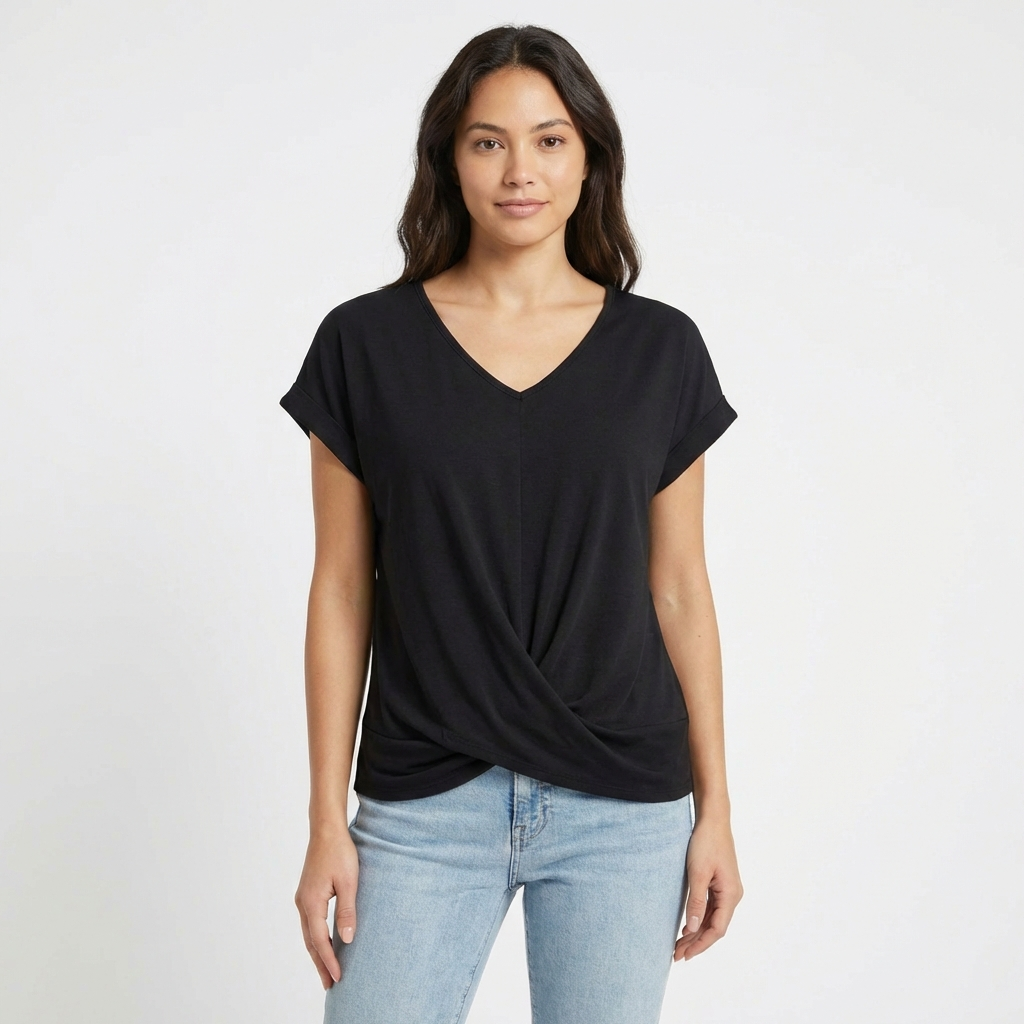 This women’s blouse features a soft twist front design and a relaxed short sleeve silhouette, offering an easy solution for everyday wear. The clean shape and v neck detail create a balanced look that feels polished without appearing overworked.