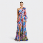 This women’s maxi dress features a one shoulder design with a flowing silhouette and floral print, offering an elegant option for summer events and special occasions. The long length and statement shape provide an easy solution for evening, party, and wedding guest styling.