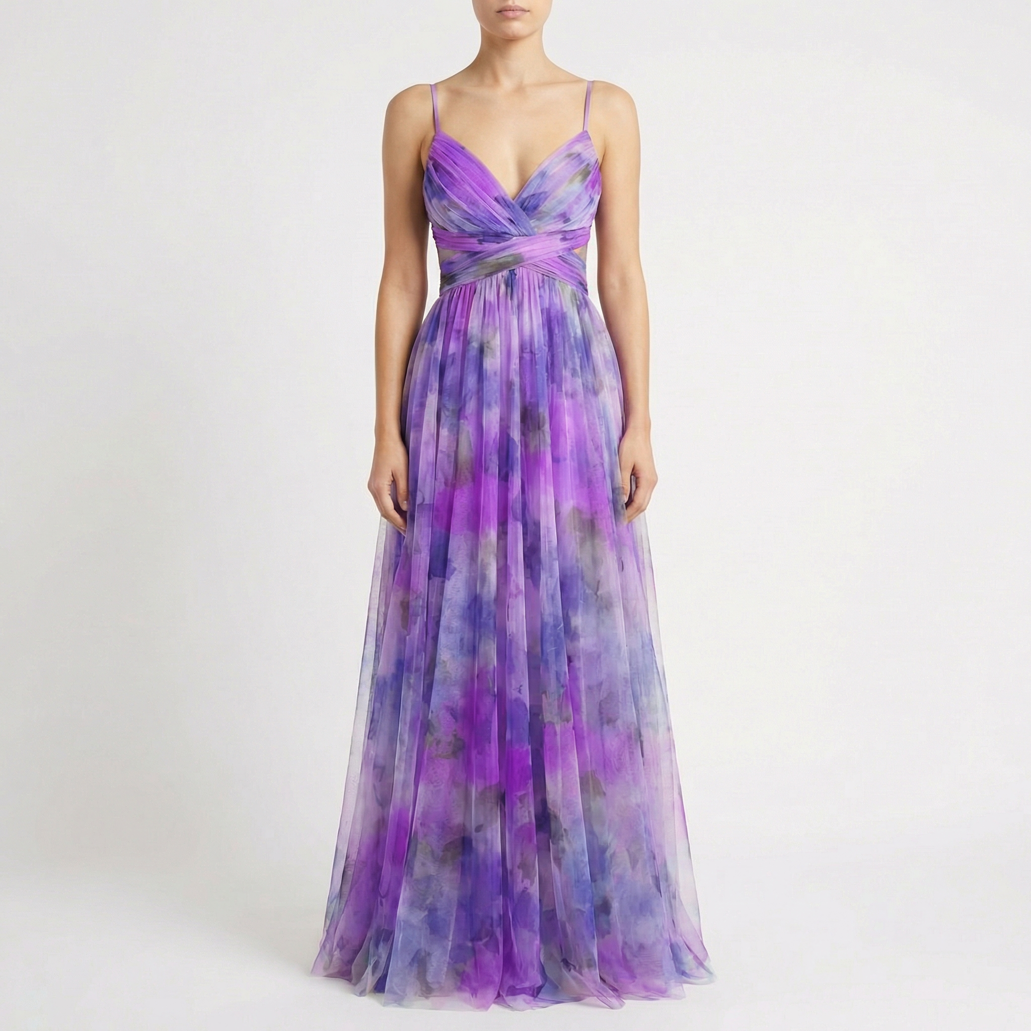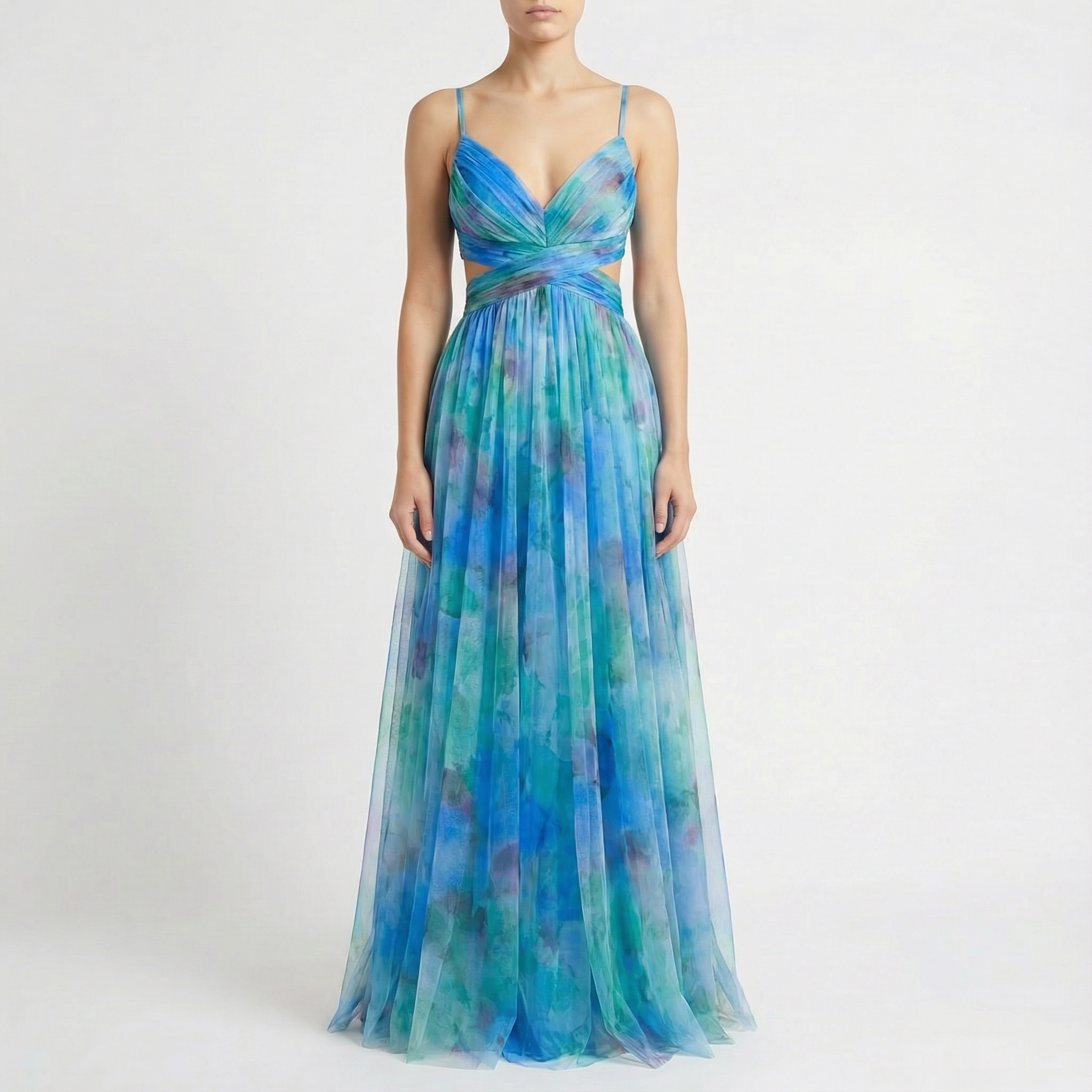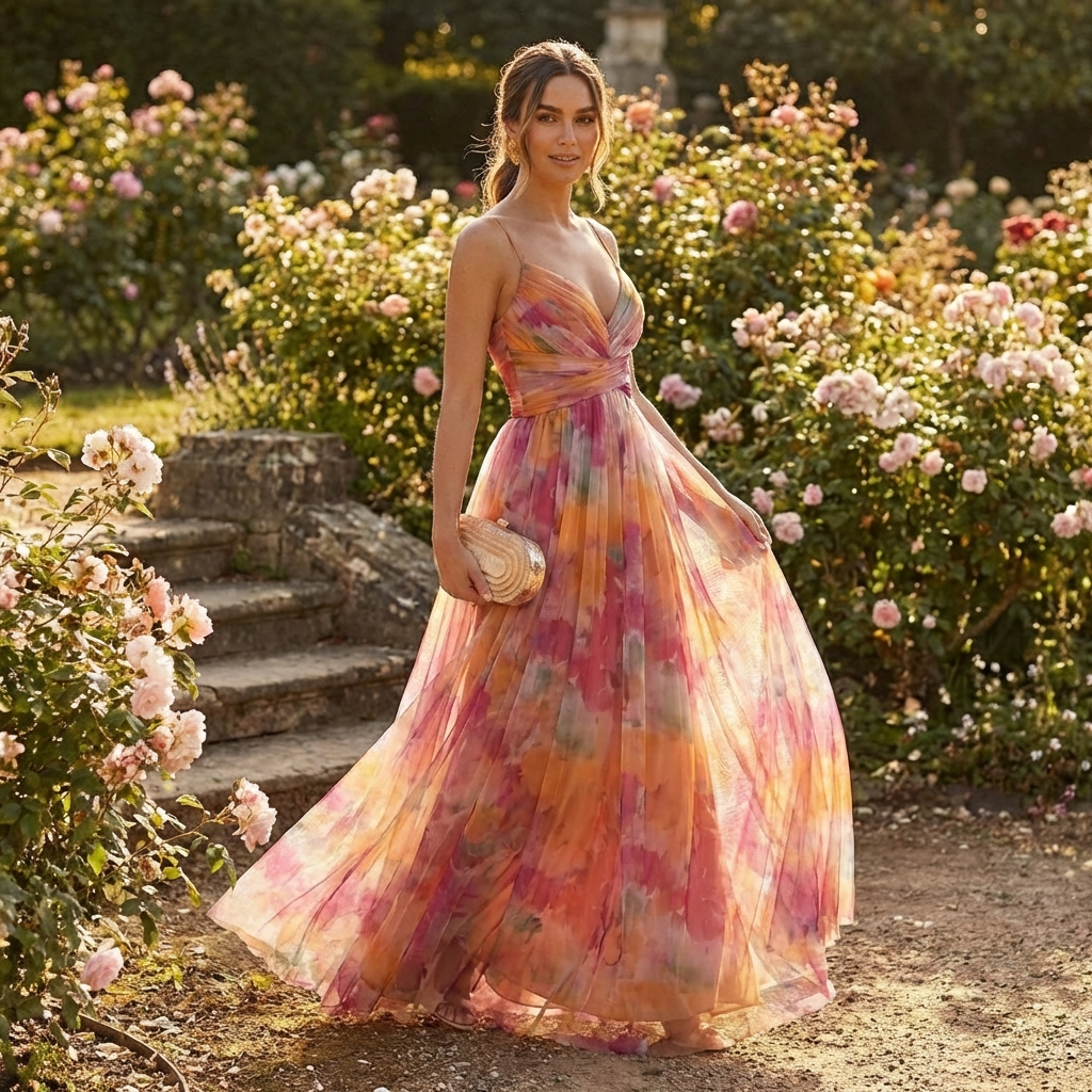 This maxi dress pairs naturally with heeled sandals and a clutch for wedding guest or evening events. For summer parties, style it with minimal jewellery to let the watercolour print and open back detail stand out.