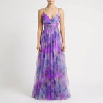 This women’s maxi dress features a flowing silhouette with a soft watercolour print, designed for summer events and special occasions. The long length and fluid shape offer an elegant option for party, evening, and wedding guest styling, finished with an open back and tie detail.
